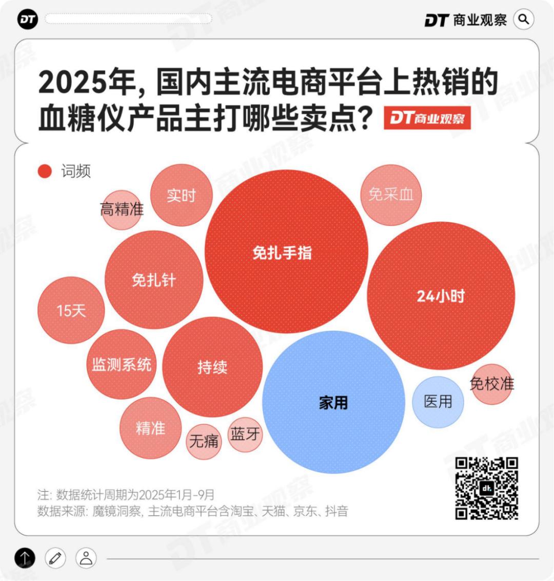 根据魔镜洞察的数据,在2025年国内主流电商平台上,动态血糖仪的卖点高度集中于产品功能与适用场景,“免扎手指”“24小时持续监测”“实时”以及“精准”等关键词高频出现。