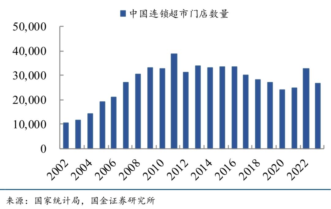 图3:我国连锁超市的门店数不断下滑(数据来源:国家统计局,国金证券研究所)