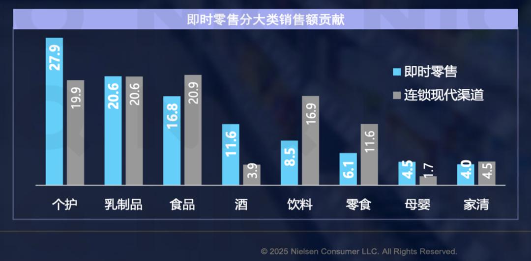 图7:酒水在即时零售渠道的销售额贡献远超连锁现代渠道(数据来源:尼尔森《2025上半年零售格局演变和机会报告》)