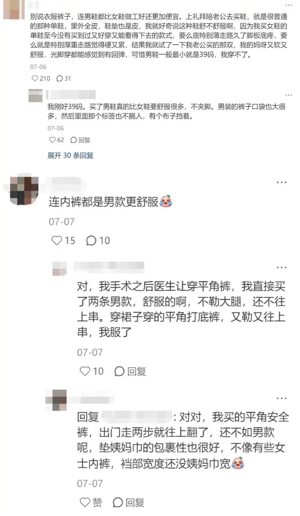 不仅做工质量、性价比都远超女装,男装的设计细节甚至比女装都周到了不止一点。比如,在衣服内侧总是扎人的水洗标签,男装就有一块帆布遮挡;再比如,男装的裤兜比女装大、深很多,完全能够装下一部手机;甚至有人发现,连男士内裤的布料都比女士的舒适,穿上之后也不会像女士内裤一样向上卷边,引起尴尬。