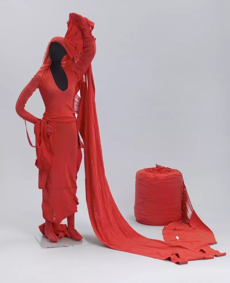 1997 年,三宅一生与纺织艺术家藤原大 (Fujiwara Dai) 走到一起,共同开发了一套完整的成衣制作流程:一根线从这一边进入电脑编程的机器,另一边吐出来的,是完整的衣服,完全去掉了裁剪与缝纫,也彻底颠覆了传统制衣的流程。