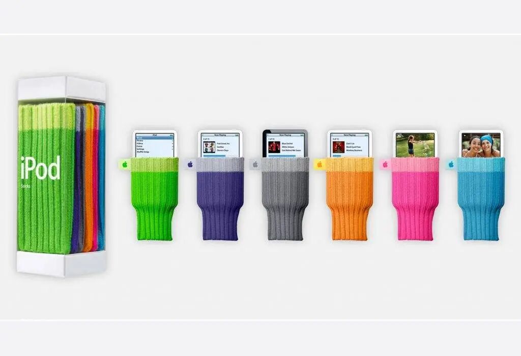 2004 年,苹果推出了一盒六色的 iPod Socks,售价 29 美元,采用针织材质,适配当时几乎所有 iPod,也能收纳耳机、数据线、钥匙,甚至还能用针织表面顺手擦屏。