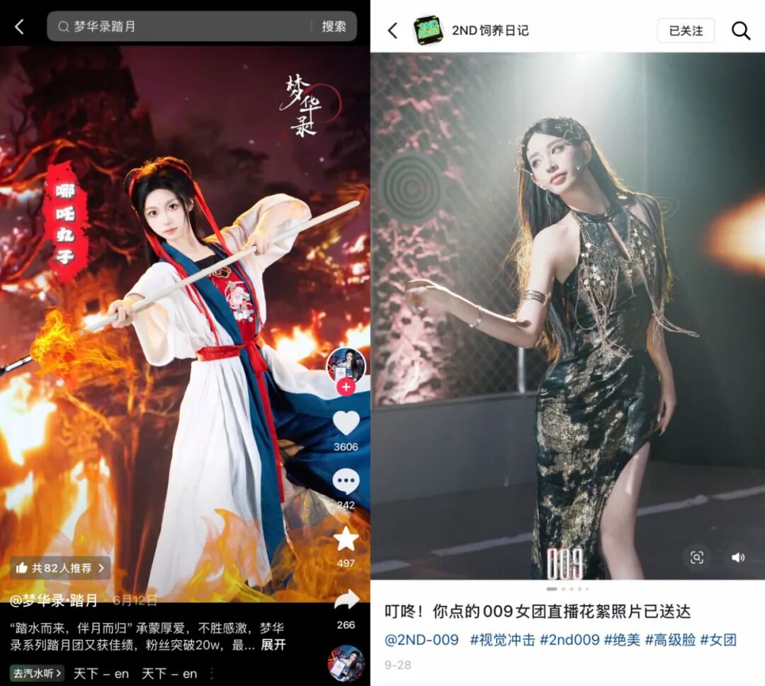 部分团队会运用前沿技术让直播内容更具看点,比如探索XR(扩展现实)、虚拟直播等新技术,打造虚实结合的沉浸式视听体验。女团厂牌@2ND-009,通过将变装和XR技术结合,让主播无缝切换穿搭和背景,为观众打造沉浸式的感官体验。