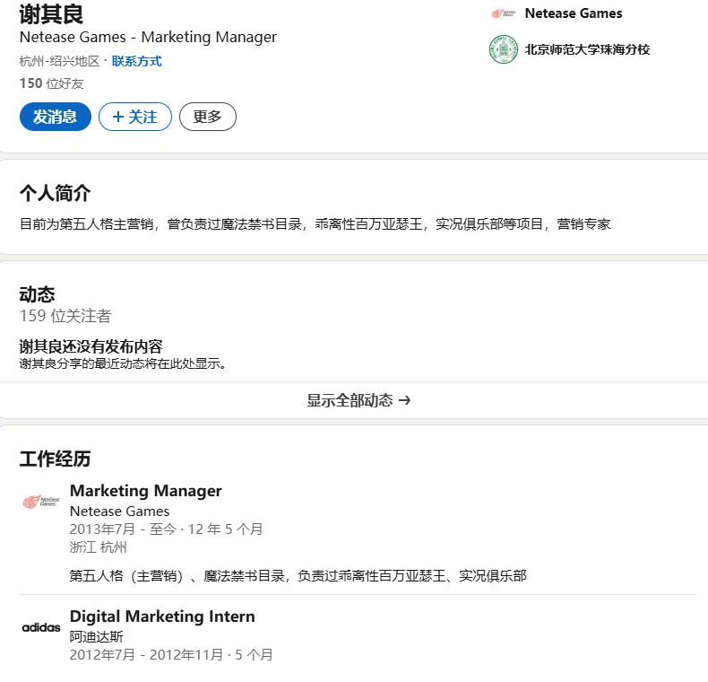 据公开信息显示,谢其良于2013年7月加入网易,曾任网易第五人格营销总监,也曾负责过魔法禁书目录,乖离性百万亚瑟王,实况俱乐部等游戏项目。2020年,谢其良加入米哈游,任职国内市场总监兼制片人,负责市场宣发。