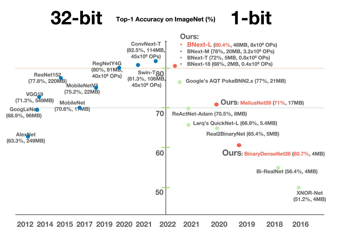 2022年底: 团队推出的BNext-L模型在ImageNet上达到了80.4%的Top-1准确率,比谷歌同期的模型高出3个百分点。这不仅仅是一个数字的突破,它意味着,极致压缩的1-bit模型,在精度上首次达到了当时端侧和云端主流部署的ResNet基准线,证明了其在视觉任务上具备了商业落地的可行性。