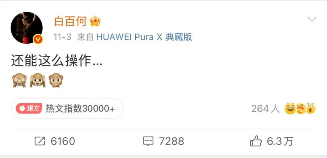 这次东京电影节会被卷入“运作”风波,并引发如此强烈的舆论震荡,导火索是白百何在11月3日发布的那条意味深长的微博:“还能这么操作…”短短六个字,外加捂眼、捂耳、捂嘴的猴头表情三连,尽管没有指名道姓,但因在奖项公布前发声,很自然地就被视作是在影射“奖项黑幕”。