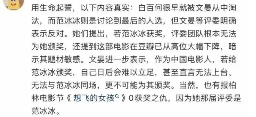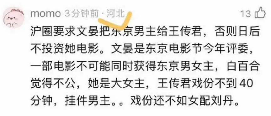 随后,有网友更是传出一张截图:“沪圈要求文晏把东京男主给王传君,否则日后不投资她电影。文晏是东京电影节今年评委,一部电影不可能同时获得东京男女主,白百何觉得不公,她是大女主,王传君戏份不到40分钟,挂件男主,戏份还不如女配刘丹。”