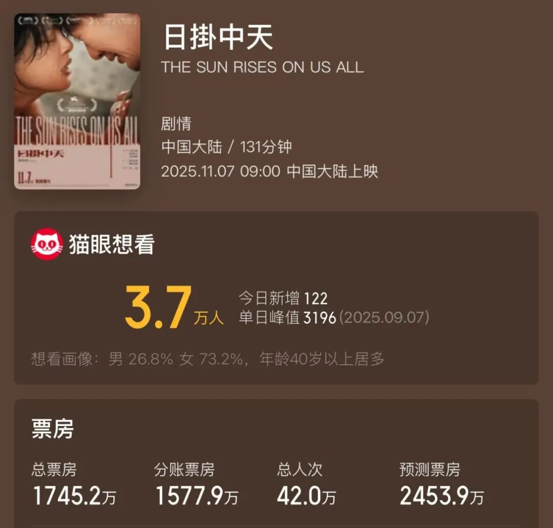 尤其在今年,电影节的奖项含金量几乎集体缩水。《日掛中天》上周在国内上映后,票房遇冷、口碑两极,观众不买账的理由很简单:“不好看”。也许放在几年前,大家看不懂文艺片时还会自我反思:“是不是我不够懂艺术?”可现在,观众更倾向于坦诚表达:“难看就是难看。”