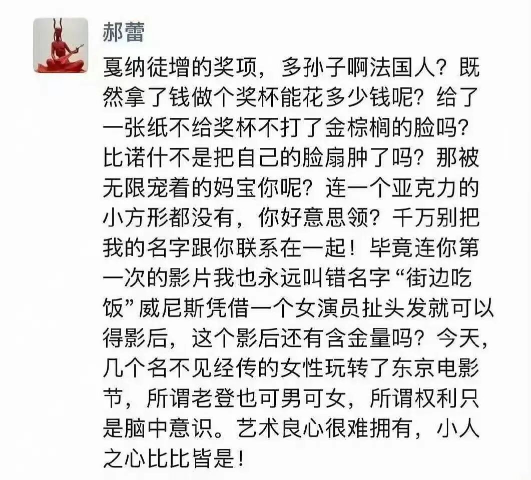 几乎同时,郝蕾在朋友圈发文怒批国际电影节早已失真,不仅提到“几个名不见经传的女性玩转了东京电影节”,还影射了赵涛为辛芷蕾撕奖,一针见血地写下那句掀起轩然大波的“威尼斯凭借一个女演员扯头发就可以得影后。”
