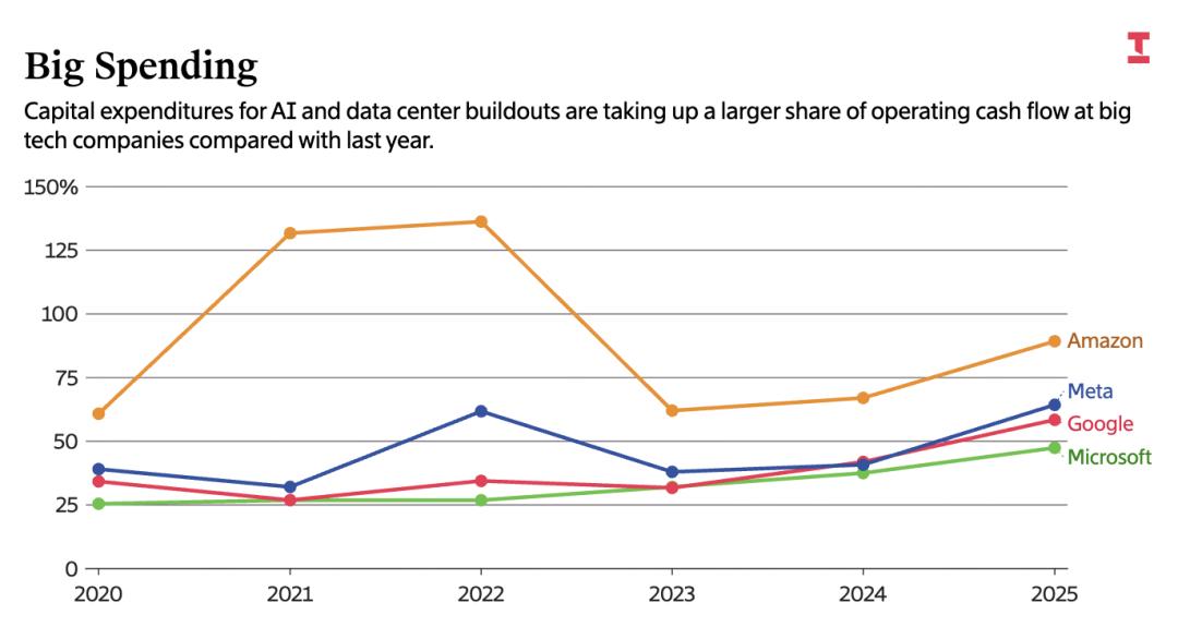 与无下限地狂揽欺诈广告收益形成鲜明对比的是,Meta 正无上限地向 AI 领域投入天价资本。其 AI 基础建设设施的资本支出指引已升至惊人的 660–720 亿美元。