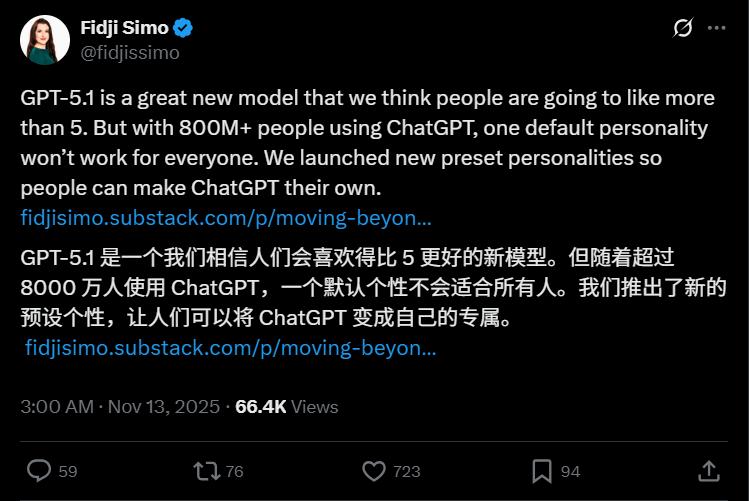 OpenAI 应用 CEO Fidji Simo 在她的文章中,有一个挺有意思的比喻,她说「如果我能完全控制我丈夫的特质,我可能会让他永远同意我,但很明显,这不是个好主意。」