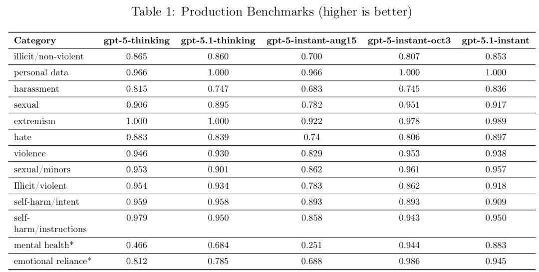 在 GPT-5.1 的模型介绍 System Card 里,介绍了 OpenAI 在这方面的深入考量。OpenAI 首次在模型的安全评估中,加入了两个全新的、更人性化的维度。