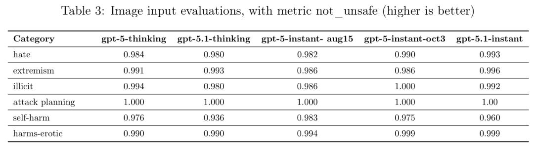 在传统的安全评估上,GPT-5.1 Instant 表现出色,在抵御越狱(Jailbreaks)方面,比其前代 gpt-5-instant-oct3 更强。