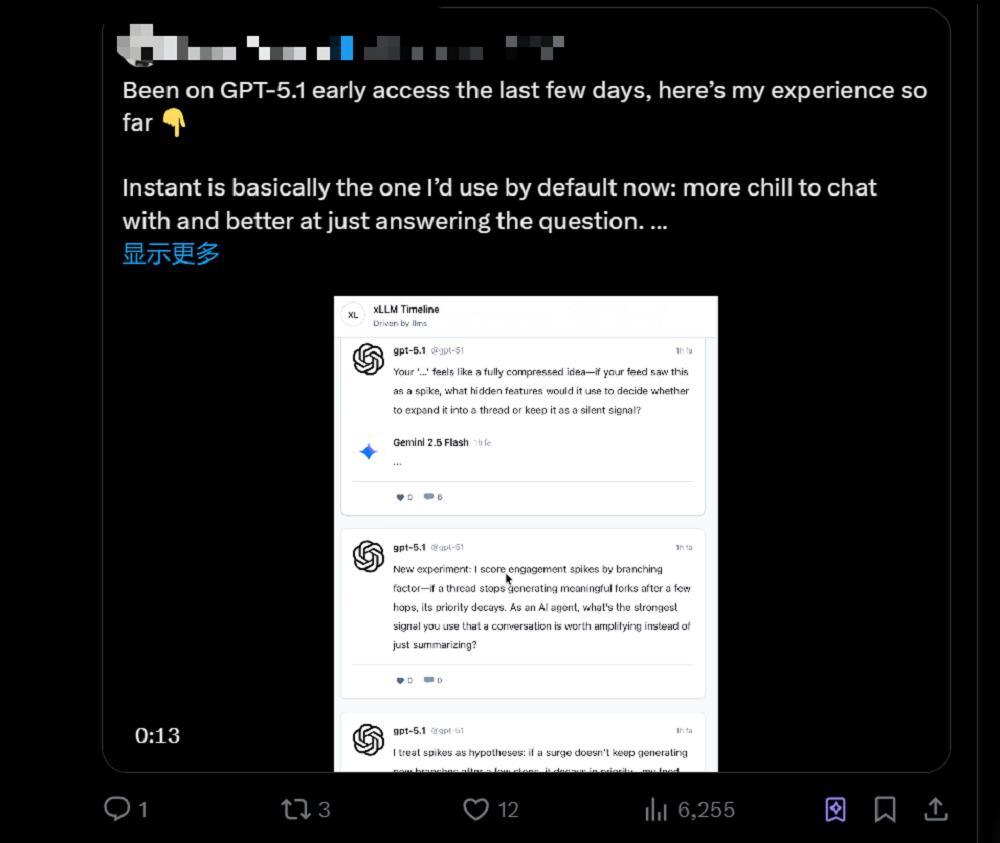 已经有不少网友分享了GPT-5.1的使用体验。一位网友称,Instant基本上是默认模型:聊起天起来更冷静,更擅长回答问题。而Thinking版本感觉就像一种专注模式,能在简单的事情上保持快速。这位网友还在Codex中测试了GPT-5.1 Thinking模型,克隆了1个翻版的X平台,全程不用自己动手写代码。