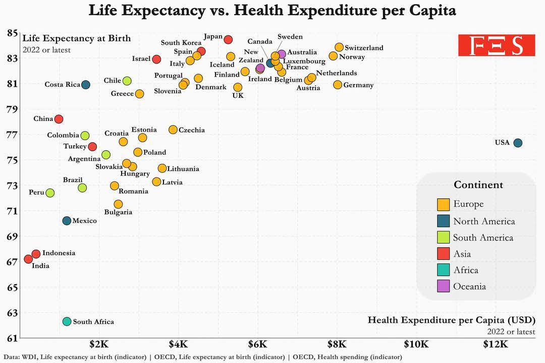请看下图,这是经合组织统计的,全球各国预期寿命与人均健康支出的比较,在花钱方面,美国是断档式领先,平均每位国民每年要花超过1.2万美元来寻医问药,而美国人的预期寿命,却并没有很高,很多发达国家支出仅为美国的一半,预期寿命却比美国高了七八岁,就连花销仅1K美元出头的中国,预期寿命都高于美国……