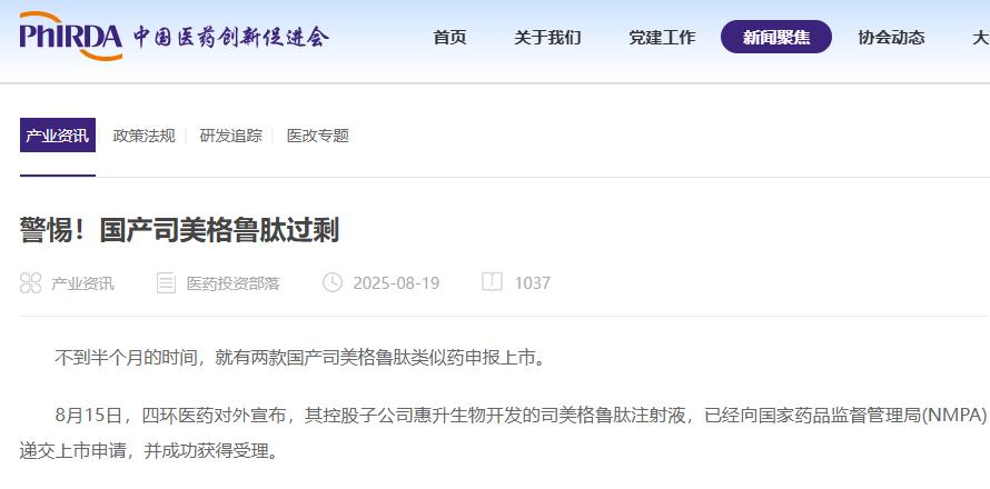 不过专利保护期是有限的,Wegovy,也就是司美格鲁肽,在中国和印度的专利在2026年就要到期了,这两个东方神秘大国,都拥有庞大和高效的仿制药产业,已经跃跃欲试了。光是中国这边,公开报道中就有十几家药企在搞司美格鲁肽仿制药,杭州九源基因、丽珠集团、石药集团、华东医药、中国生物、齐鲁制药……名单长到列都列不完,其中大部分等进入后期临床实验,只等获批了,有很大的希望在2026年集体上市。业内人士甚至认为,需要警惕国产司美格鲁肽过剩。