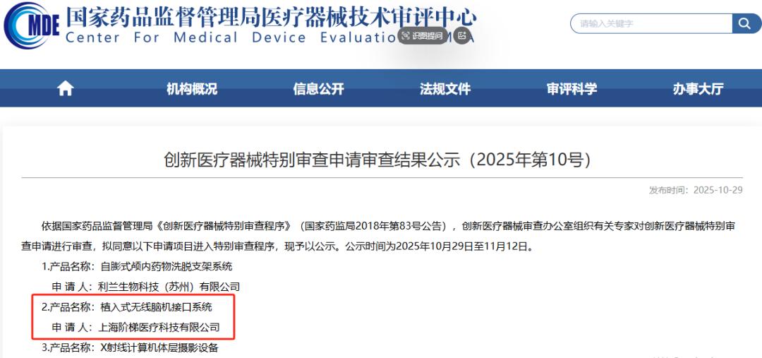 日前,由上海阶梯医疗科技有限公司自主研发的“植入式无线脑机接口系统”正式进入国家药品监督管理局医疗器械技术审评中心(CMDE)的创新医疗器械特别审查程序,这是国内首个进入该“绿色通道”的侵入式脑机接口产品。