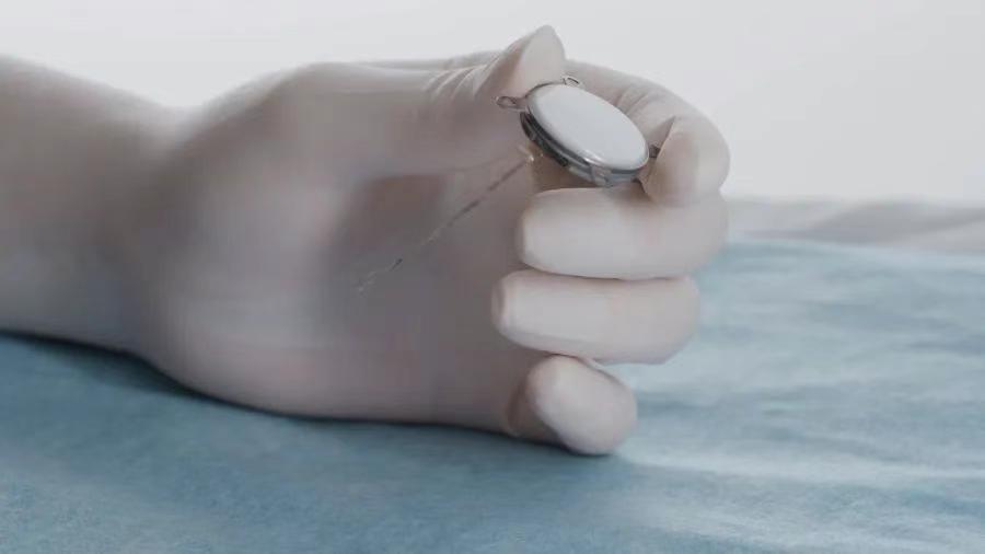 阶梯医疗的脑控植入体。呈圆形,直径26毫米,厚度不到6毫米,从植入体中伸出的电极像它的触手。