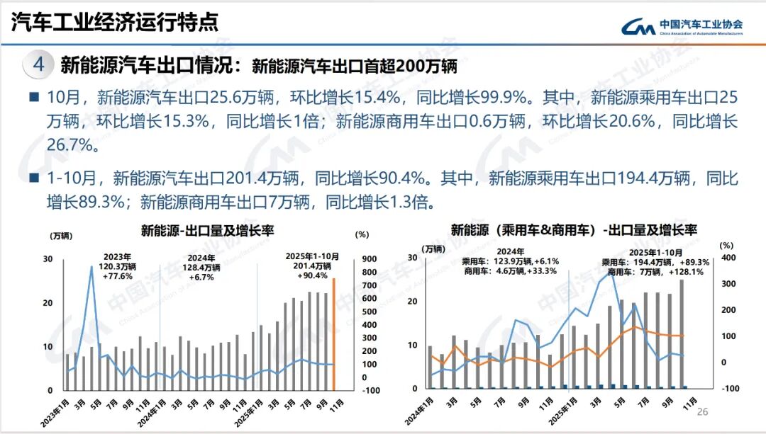 出口层面,今年1至10月,我国新能源汽车出口首次突破200万辆,达到201.4万辆,同比增长90.4%,成为拉动我国汽车出口增长的主要动力。同期,我国汽车出口561.6万辆,同比增长15.7%。其中,10月,我国汽车出口66.6万辆,环比增长2.1%,同比增长22.9%,连续三个月维持在60万辆以上水平。