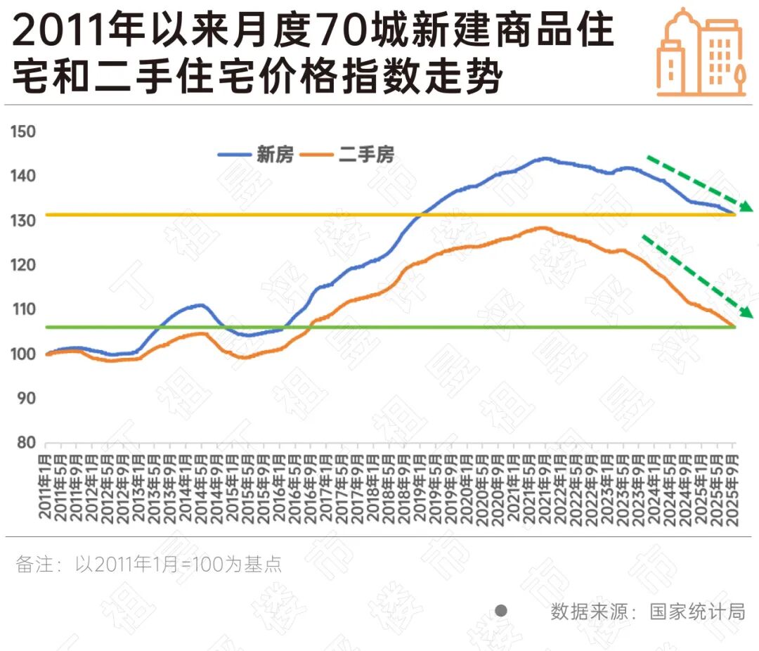 若以2011年1月份房价为基点来看,无论一手房还是二手房房价的最高点都出现在2021年下半年,随后开始逐步下降,一直到2023年出现过一波反弹,然而从2023年下半年起再次进入下跌通道。