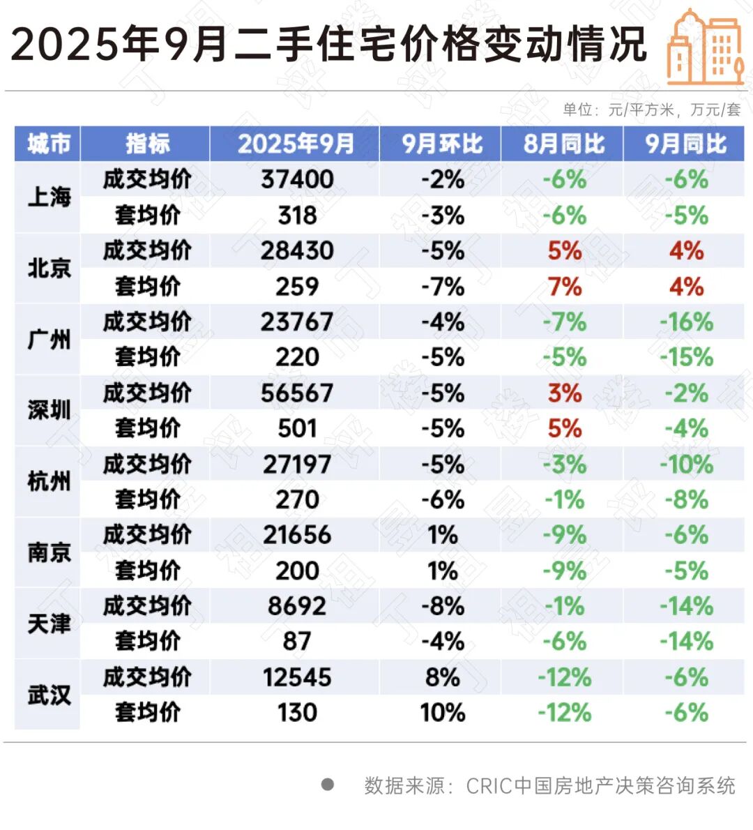 从部分重点城市来看,CRIC数据显示,广州、杭州、天津等城市二手房房价跌幅扩大,同时上海、南京、武汉等城市二手房房价跌幅收窄,北京二手房房价出现了上升。
