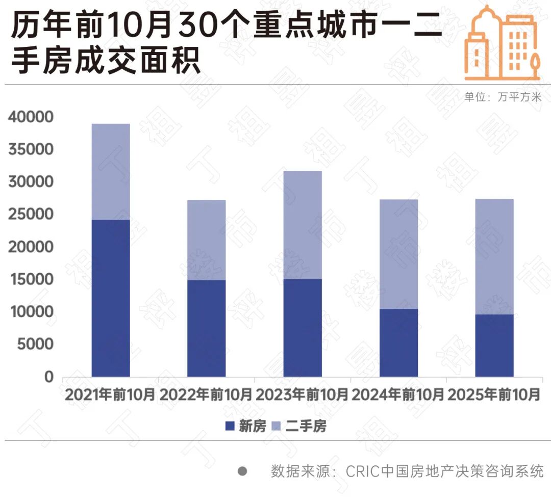 2025年前10月,30个重点城市一二手房成交面积27443万平方米,较2024年同期持平。其中新房同比下降7%、二手房同比上涨6%。