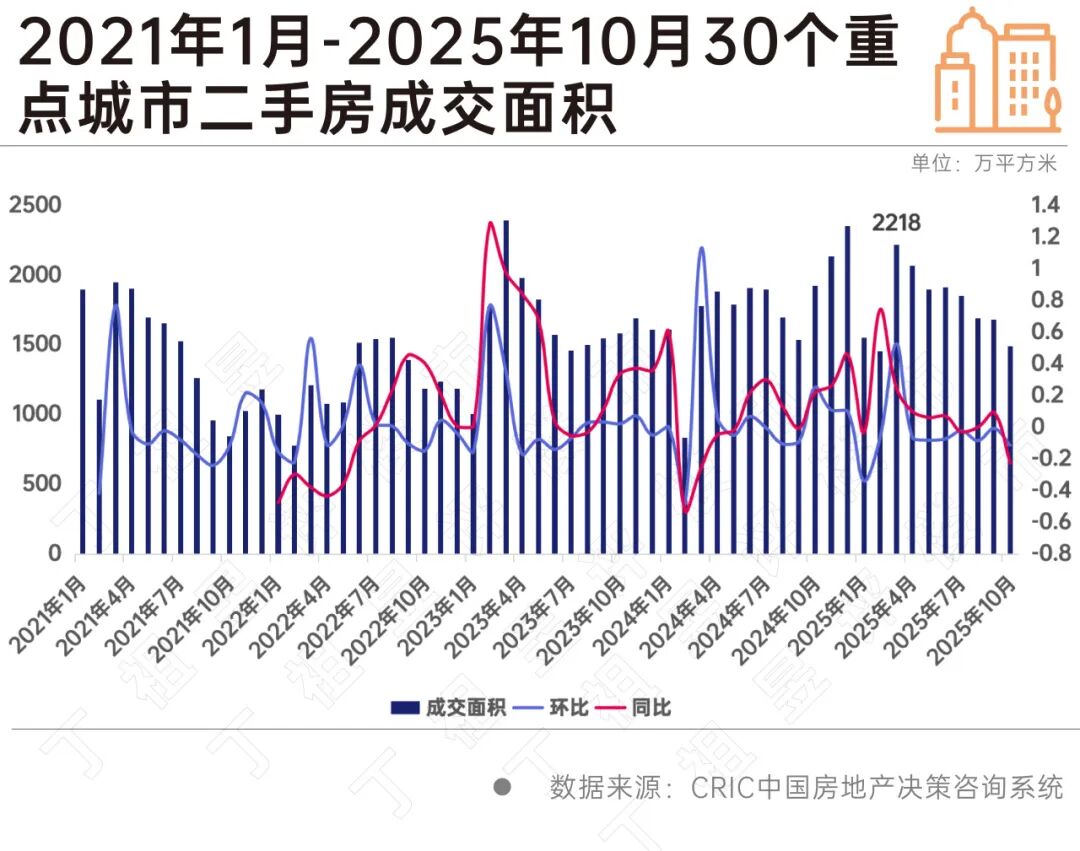 截至2025年10月,30个重点城市二手房成交面积1469万平方米,环比下降12%。