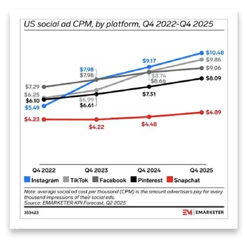 到了今年,Meta平台CPM更是暴涨,eMarketer预计四季度Instagram将成为首个CPM突破10美元的社交平台。而在2022年四季度时,Instagram还曾是几大社交平台中CPM最低的一个,至今涨幅高达91%。