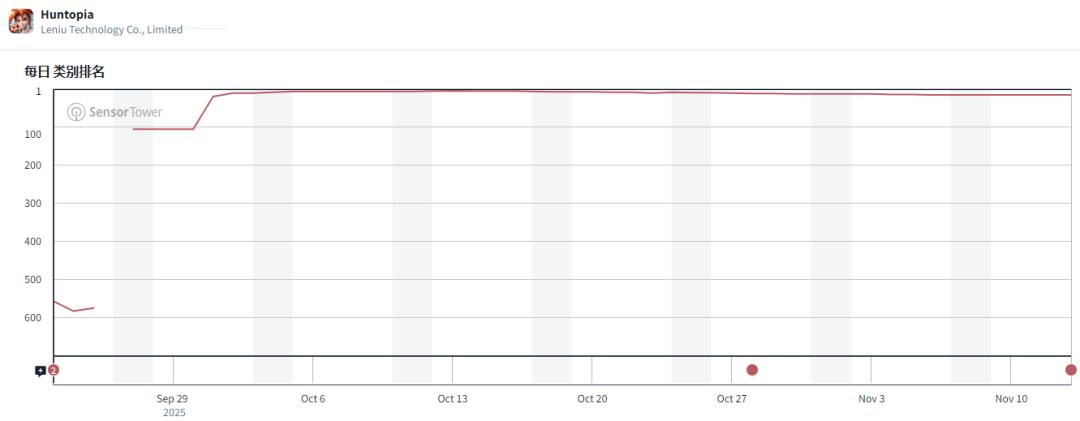 今年9月,广州乐牛旗下《Huntopia》在全球发布,很快便跻身美国Google Play游戏畅销榜TOP100,此后长期保持在RPG品类畅销榜前20名。
