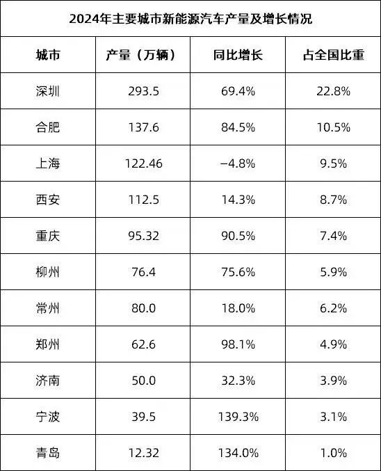 到2024年,西安新能源汽车产量仍仅次于深圳、合肥、上海,居全国第四。