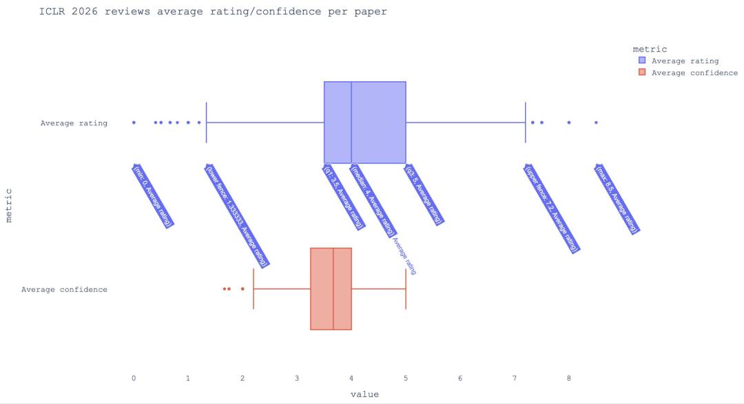 ICLR 2025平均分为5.12分,ICLR 2026平均为4.20。