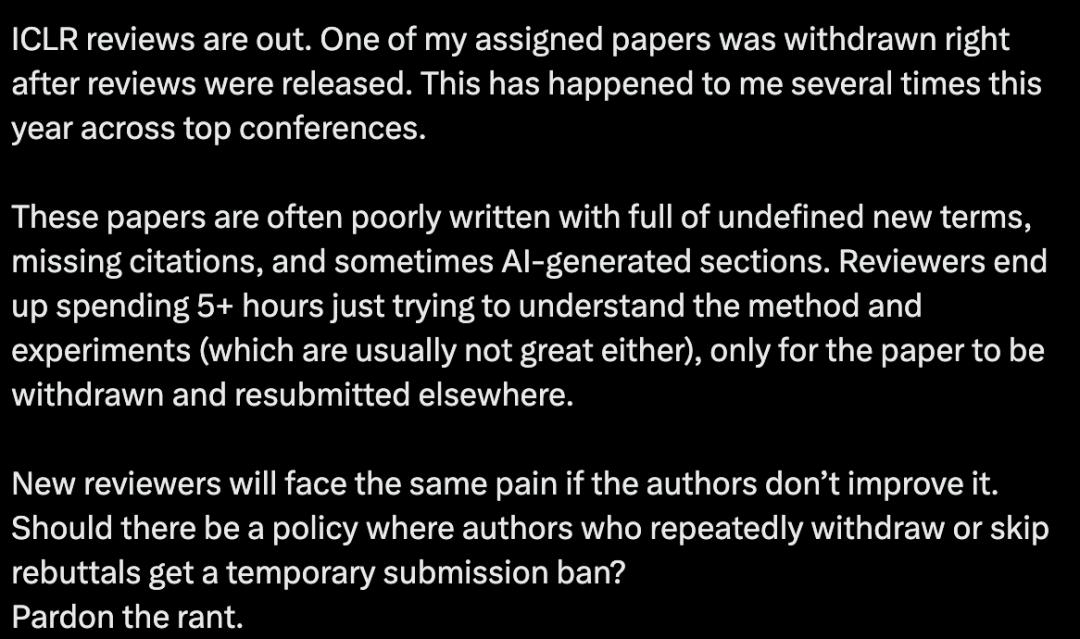 不过,他之后另发推文表示,某些论文和评审的质量之低,让人沮丧。