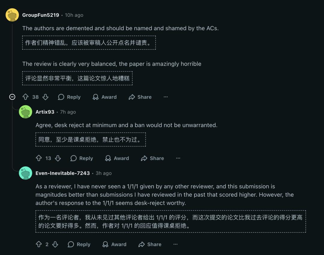不少投稿人对AI顶会的同行评议,意见也很大。