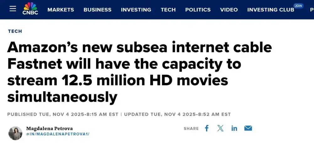 就拿亚马逊的Fastnet海底光缆来说,设计容量不低于320Tb/s,传输速率相当于每秒可传输1250万部高清电影。
