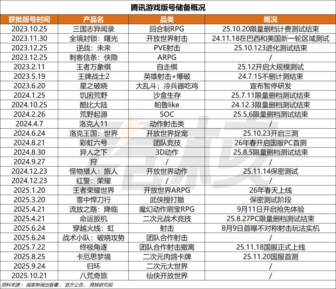 据竞核不完全统计,截至11月13日,腾讯游戏已获批版号的新产品共计27款。从游戏品类上来看,覆盖开放世界RPG、开放世界射击、开放世界捉宠、PVE射击、3D动作、团队竞技、PvEvP、二次元、自走棋等。