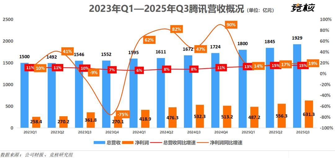 11月13日,腾讯发布了2025年第三季度业绩报告。财报显示,Q3腾讯实现营收1929亿元,同比增长15%。按国际财务报告准则,期内本公司权益持有人应占盈利631亿,同比增长19%。腾讯在财报中表示,这一坚实增长反映公司游戏、营销服务、金融科技及企业服务等业务的健康趋势。