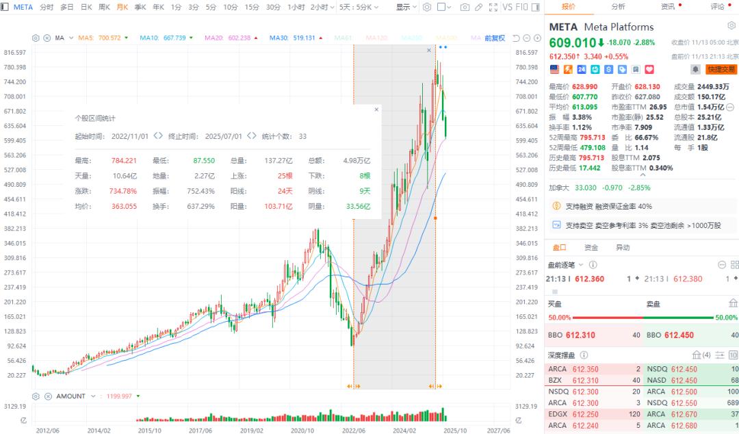 2025年9月中旬,Meta股价在748美元的高位盘旋不足两周,一场由“财报惊雷”与“信任崩塌”引发的抛售潮突然袭来。到11月12日,股价已跌至609美元,两个月内蒸发近20%市值。