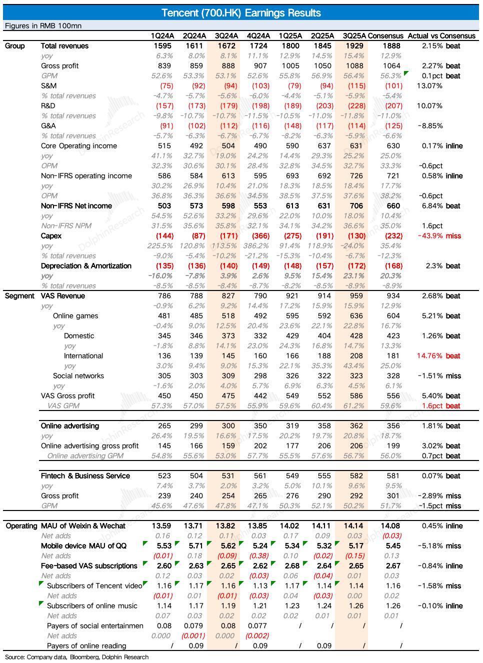 北京时间11月13日港股盘后,腾讯发布了2025年三季度业绩。整体看与预期相比虽然惊喜不多,但依旧稳字当头,三大业务线基本没有明显短腿。今年起腾讯已经进入新的投入周期,但仍能看到管理层精细化经营、有效平衡资金配置的痕迹。