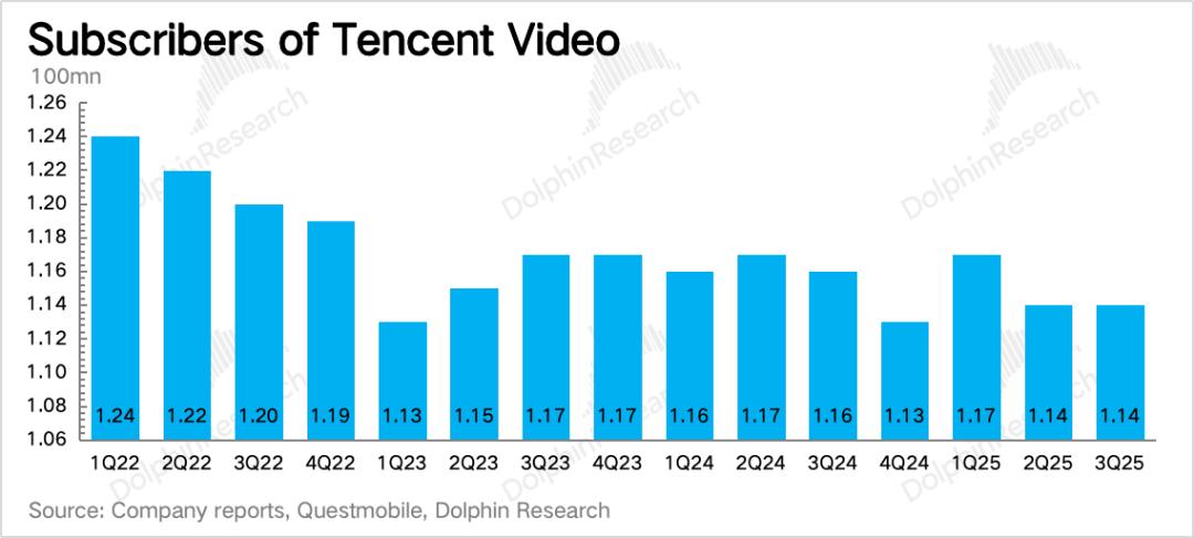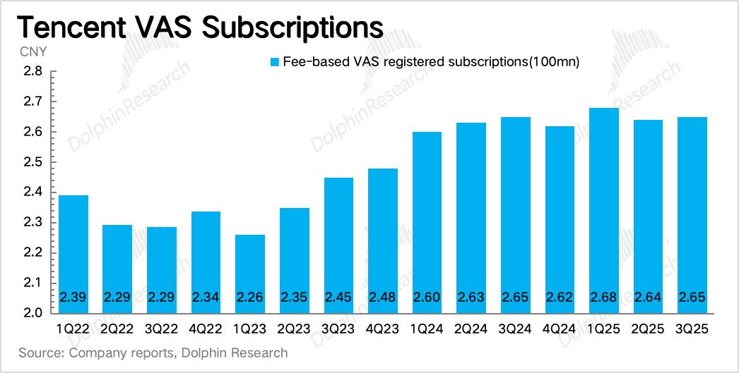 三季度增值服务付费用户数回来100万人,达到2.65亿。增量主要来自于腾讯音乐,腾讯视频会员用户数环比持平,还是1.14亿。