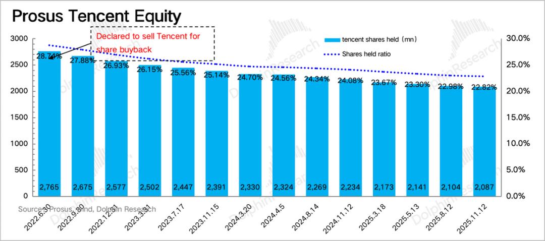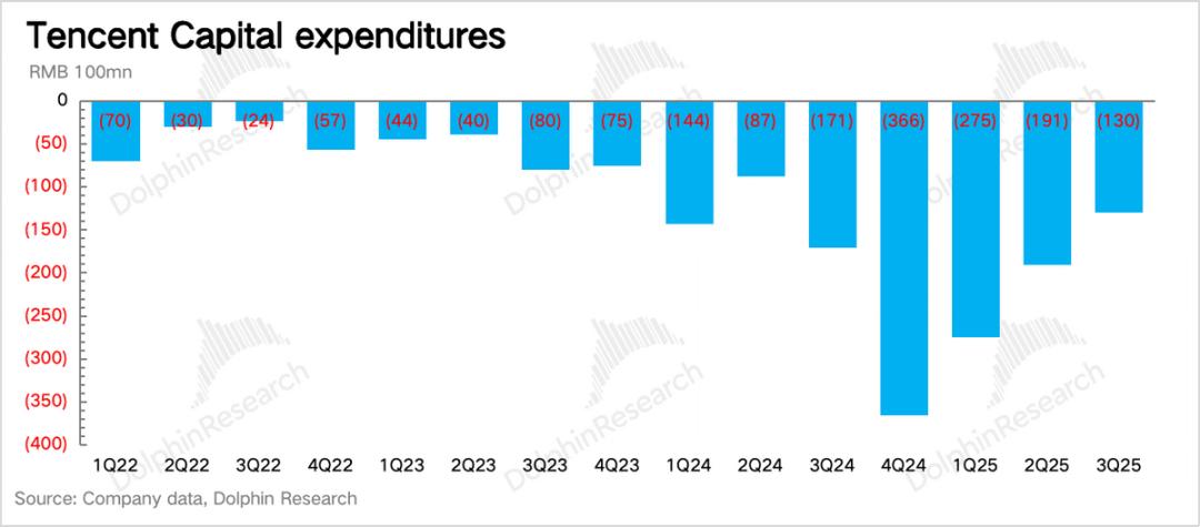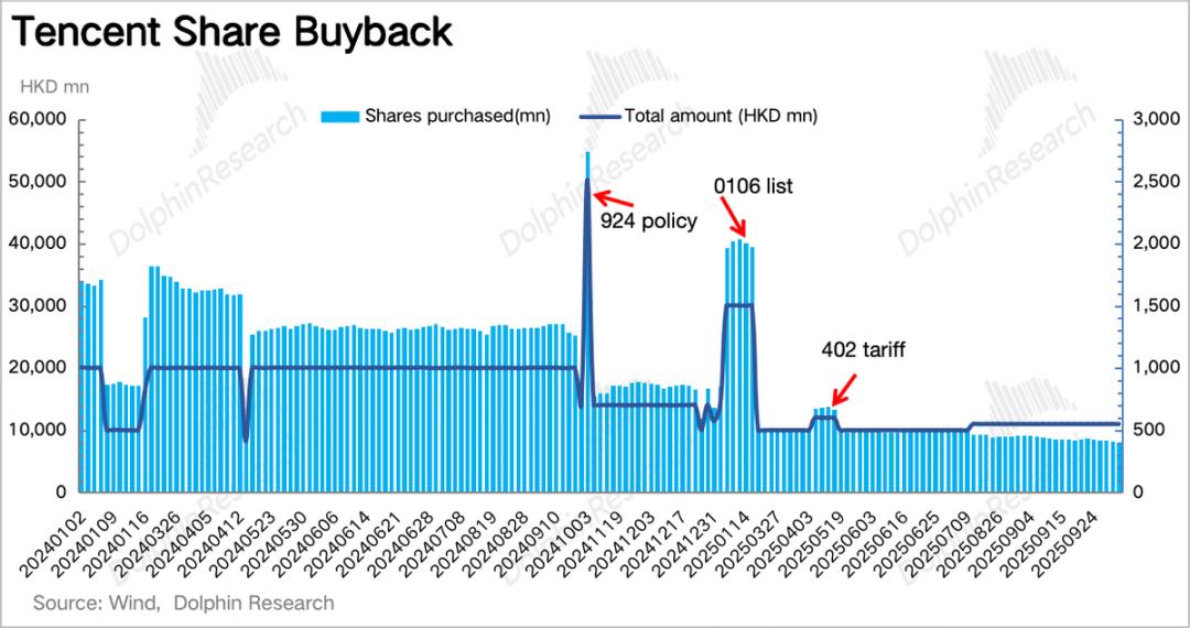 海豚君认为,这其中有腾讯管理层精细权衡投入产出的考量,但同时也怀疑可能是受到H20等海外芯片限购的影响,采购节奏暂时放缓。Q3回购211亿港元,环比继续小有增加,前三季度变化趋势正好与资本开支相反。