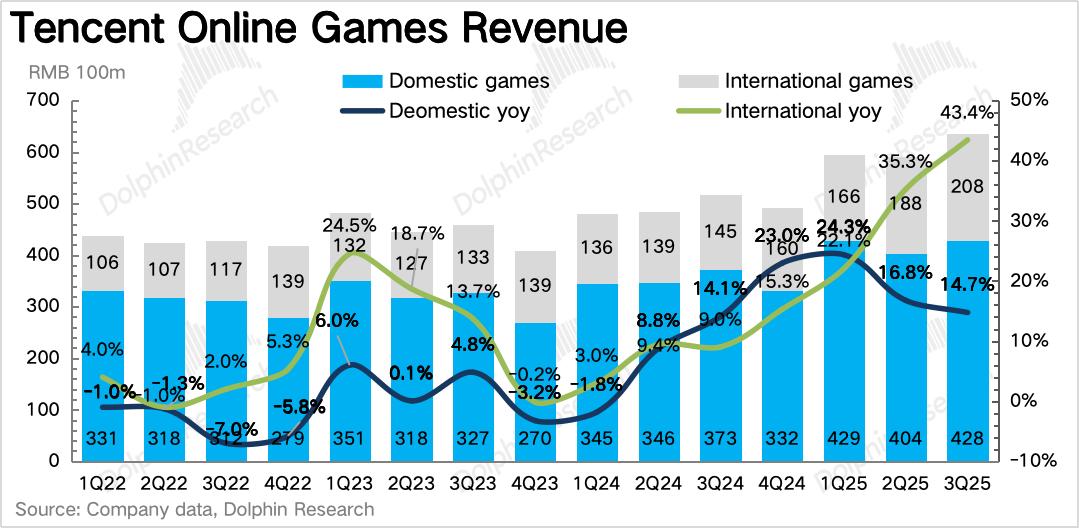 三季度网络游戏收入636亿,同比增长23%,其中国内增长13%,海外增长43%(汇率顺风大约1pct),超预期主要在海外。