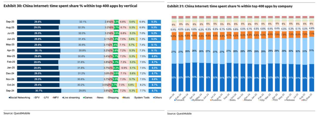 在不同生态时长的占比上,腾讯继续稳定在31%,字节系则仍然在提升,但压缩的已经不是腾讯,而是来自快手、百度等平台。