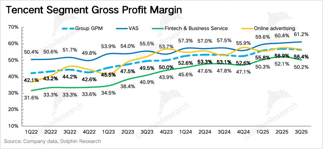 4. 毛利率稳定:集团毛利率同比提升1个多点,环比略微下降。其中自研游戏、视频号、搜一搜等高毛利率业务与低毛利率的云业务对冲,同时持续的AI投入也开始增加到折旧摊销中(同比加速增长23%,占收入比重提高0.5pct)
