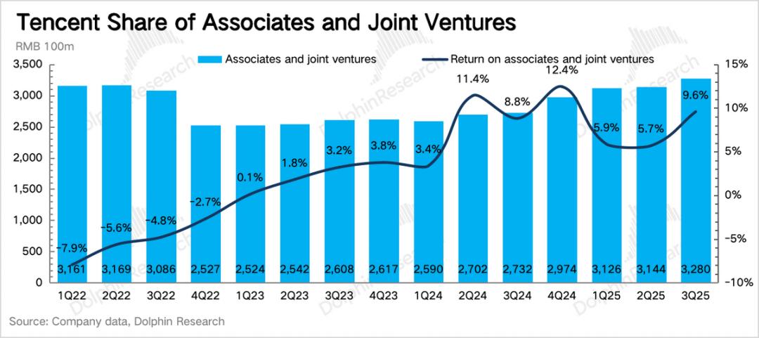 截至三季度末,公司联合/合营资产规模合计3280亿,计算得三季度腾讯的投资收益率为9.6%(年化),环比二季度季度有所提高。