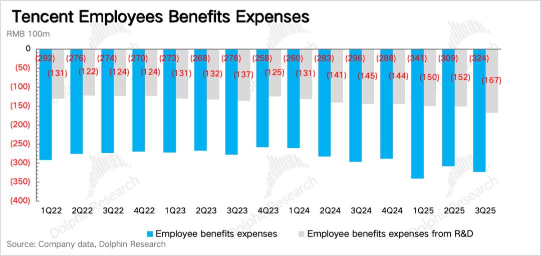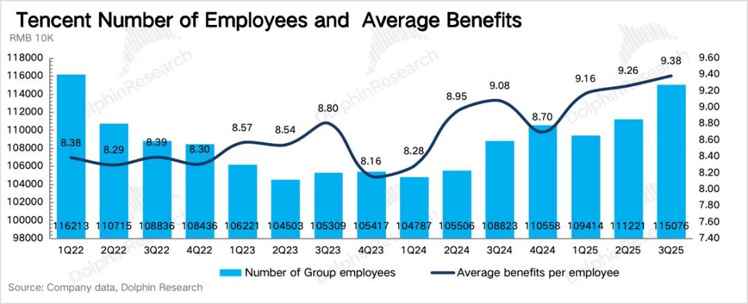 从雇员人数上看,三季度相比二季度末继续增加3855人,这里面有季节性应届生的增量贡献。从持续走高的人均薪酬和研发人员薪酬在整体员工薪酬中的占比来看,高薪研发人员的扩招需求仍然旺盛。不过财报中也提及,目前AI对编程、游戏及视频制作带来的效率提升。