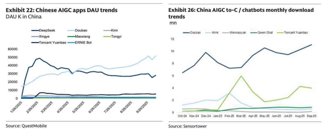 三季度元宝app下载量有所反弹,但豆包仍是翘楚,无论是存量规模还是增量规模。不过混元模型已经嵌入到腾讯系产品,整个生态的用户规模和使用量情况,可以关注下电话会。