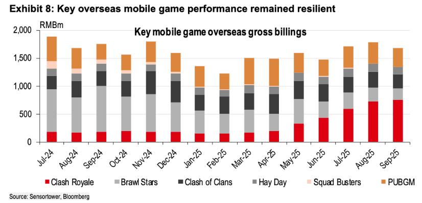 (2)海外市场:Q3继续炸裂增长43%(汇率中性下增速为42%),主要得益于Supercell的《皇室战争(Clash Royale)》(下图红柱)+收购新工作室+新款PC/主机游戏《消逝的光芒:困兽》,填补了《荒野乱斗(Brawl Stars)》萎缩缺口。