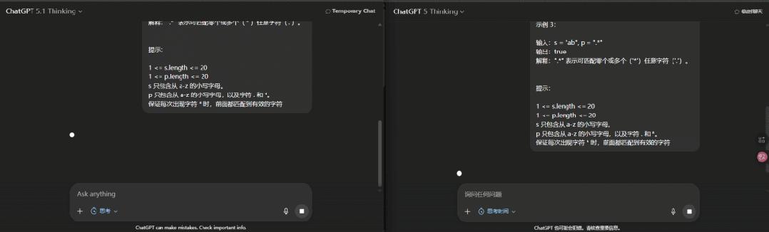 而到了复杂的编程难题,反而是 5 Thinking 更快给出了错误结果,5.1 思考了更长的时间给出了正确答案。