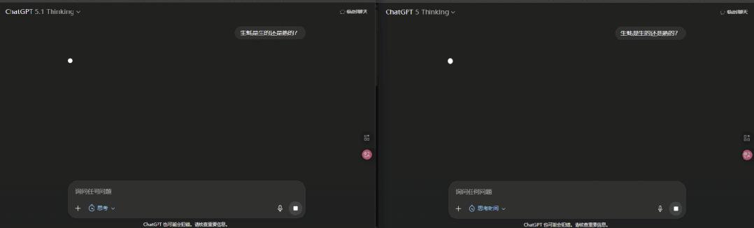 世超试了试,它的效果还挺明显的。在简单的逻辑问题上,左边 5.1 Thinking 的思考速度明显比右边 5 Thinking 要快得多。