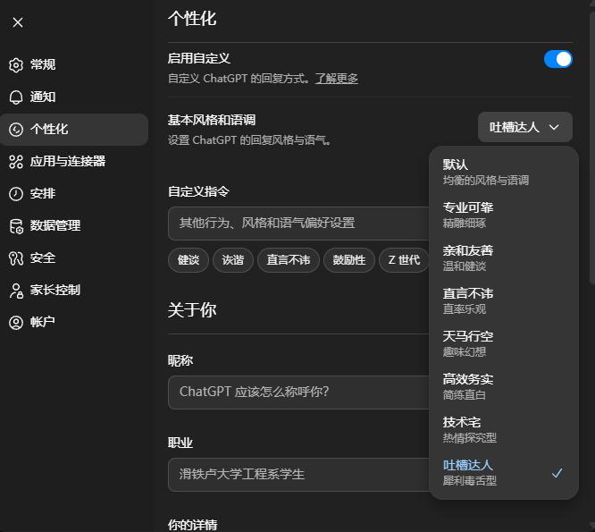 除了上面这些属于 5.1 的版本变动,ChatGPT 还有个整体大更 —— 在个性化里面可以设置 GPT 的回答风格,除了默认一共七种人设可选。